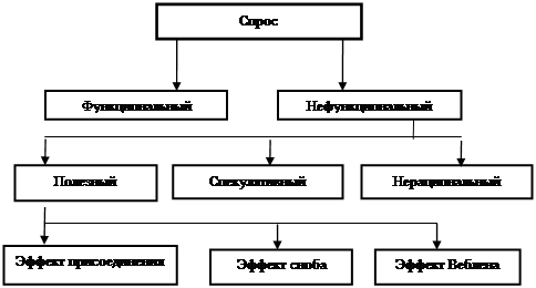 Полезность (на схеме это обозначено как полезный спрос), извлеченная из данного товара, увеличивается или уменьшается в зависимости от того, покупают ли другие этот товар, либо благодаря тому, что этот товар имеет более высокую цену по сравнению с иными товарами. Данный вид спроса подразделяется на три части, которые называются: