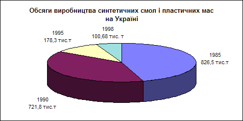 Що стосуiться Украiни, то виробництво пластмас в 1999 роцi скоротилось в 7,7 разiв порiвняно з 1985 роком. Такий стан пояснюiться рядом причин, що привели до занепаду економiки держави.