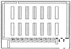 "Решетка" с линейным продольным размещением оборудования, т.е. стеллажи с товарами преимущественно располагаются перпендикулярно входящему в зал покупательскому потоку.