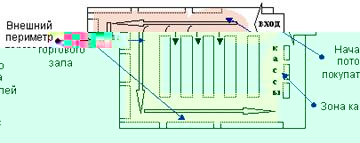 Движение потока покупателей должно быть рассчитано заранее и подобрано с максимальной выгодой, предоставляя на обозрение покупателю как можно больше товаров.