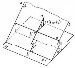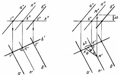 На рис. 68 построена линия наибольшего наклона плоскости к горизонтальной плоскости проекций тАФ прямая . Угол наклона плоскости к плоскости H получают при определении натуральной величины отрезка KM при построении прямоугольного треугольника по проекциям K¢M' и