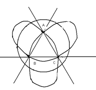 которое выражает кривую 2-го порядка, например окружность, пересекает какую-либо сторону координатного треугольника в двух точках, то соответствующая кривая второго порядка должна иметь, по свойству квадратичного преобразования, в противолежащей вершине этого треугольника две касательные и, значит, узловую точку. Если указанные две точки совпадают в одну, то совпадают в одну и соответствующие им касательные и, значит, узловую точку. Если указанные две точки совпадают в одну, то совпадают в одну и соответствующие им касательные, и следовательно, кривая четвёртого порядка будет иметь в вершине треугольника точку возврата. Если, наконец, точки пересечения кривой второго порядка со стороной треугольника будут мнимыми, то противолежащая вершина треугольника является изолированной точкой кривой четвёртого порядка.
