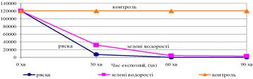 В умовах лабораторного експерименту нами проведено вивчення дii екстрактiв iз зелених водоростей (Сhlorella vulgaris, Ankistrodermus bijugatus, Scenedesmus quadricauda) i вищих водяних рослин тАУ ряски малоi (Lemna minor L.) на здатнiсть останнiх iнактивувати патогеннi бактерii та вiруси в стiчних водах (рис. 1).