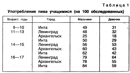 Недаром в народе говорят: ВлРеки начинаются с руВнчейка, а пьянство тАФ с рюмочкиВ». Во многих случаях приобщение к алкоголю начинается с пива, об употреблеВннии которого учащимися писали психологи Б. С. Братцев и П. И. Сидоров в книге ВлПсихология, клиника и проВнфилактика раннего алкоголизмаВ», вышедшей в 1984 году в издательстве МГУ (табл. 1).