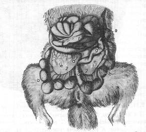 Рис. 1. Органы брюшной полости беременной собаки (по Schummer, 1987) Брюшная область открыта с вентральной стороны, большой сальник откинут, извлечена матка с плодами