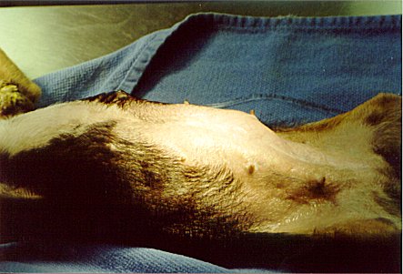 Подкожный слой тупо отделяется ножницами для того, чтобы попасть прямо в Sulcus intermammalaris и не повредить молочные железы. Затем брюшная стенка приподнимается с помощью пинцета, и брюшная полость аккуратно вскрывается по белой линии. Рана расширяется ножницами в обе стороны. (Ниманд, Сутер, 2004)