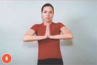 5. Упражнения для груди. Они помогают укрепить грудные мышцы, поддерживающие молочные железы, масса которых во время беременности существенно увеличивается. Одно из возможных упражнений: соедините ладони на уровне груди (дыхание не задерживать), с силой надавите ладонями друг на друга, досчитайте до пяти, после этого расслабьтесь (см. фото 6). Это упражнение можно выполнять до 100 раз в день (разумеется, количество повторов нужно наращивать постепенно).