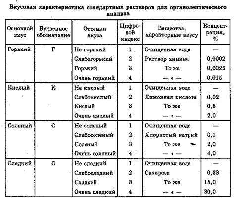 Ощущения вкуса условно обозначают буквенными выражениями: К тАФ кислый, О тАФ сладкий, Г тАФ горький, С тАФ соленый. Но ощущения вкуса гораздо богаче, чем 4 элементарные восприятия. В комплексном ощущении они комбинируются с осязательными, температурными и обонятельными восприятиями. Для дополнения основного вкуса следует ввести обозначения привкуса, например "КО" тАФ кисло-сладкий, "ГС" тАФ горько-соленый и т. д., где первая буква указывает на преобладание одного вкуса над другим.