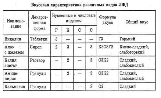 Метод оценки вкуса с помощью буквенных и числовых индексов (предложенный И. А. Егоровым). С целью выражения данных органолептической оценки препарата в более объективных и сравнимых показателях, предложена так называемая "формула вкуса". Сущность ее заключается в том, что важнейшие качественные признаки препарата оцениваются буквенными и числовыми индексами, составляющими "вкусовую карту", что впоследствии дает возможность записать общую формулу вкуса данного лекарства.