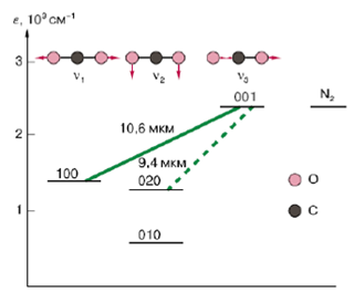 Цикл лазерной накачки CO2-лазера в стационарных условиях выглядит следующим образом. Электроны плазмы тлеющего разряда возбуждают молекулы азота, которые передают энергию возбуждения несимметричному валентному колебанию молекул CO2, обладающему большим временем жизни и являющемуся верхним лазерным уровнем. Нижним лазерным уровнем обычно является первый возбужденный уровень симметричного валентного колебания, сильно связанный резонансом Ферми с деформационным колебанием и поэтому быстро релаксирующий вместе с этим колебанием в столкновениях с гелием. Очевидно, что тот же канал релаксации эффективен в том случае, когда нижним лазерным уровнем является второй возбужденный уровень деформационной моды. Таким образом, CO2-лазер тАУ это лазер на смеси углекислого газа, азота и гелия, где CO2 обеспечивает излучение, N2 тАУ накачку верхнего уровня, а He тАУ опустошение нижнего уровня.