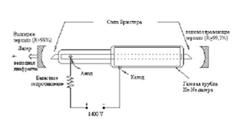 Наибольшая кратковременная стабильность, простота и надежность конструкции гелий-неонового лазера достигаются при установке зеркал резонатора внутрь разрядной трубки. Однако при таком расположении зеркала сравнительно быстро выходят из строя за счет бомбардировки заряженными частицами плазмы разряда. Поэтому наибольшее распространение получила конструкция, в которой газоразрядная трубка помещается внутрь резонатора (рисунок 5), а ее торцы снабжаются окнами, расположенными под углом Брюстера к оптической оси, обеспечивая тем самым линейную поляризацию излучения. Такое расположение имеет целый ряд преимуществ тАУ упрощается юстировка зеркал резонатора, увеличивается срок службы газоразрядной трубки и зеркал, облегчается их смена, появляется возможность управления резонатором и применения дисперсионного резонатора, выделения мод и т.п.
