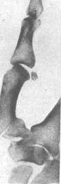 При переломах фаланг наблюдаются обычные признаки переломов костей: припухлость и кровоизлияние в области перелома, наличие деформаций, болезненность при пальпации области перелома и нарушение функции поврежденного пальца. Все эти признаки имеются при смещении отломков. Выраженная деформация отсутствует при переломах без смещения (рис.6, 7), трещинах и внутрисуставных повреждениях (9, с.89).