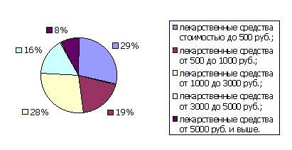 В исследуемый период наибольший удельный вес имели препараты стоимостью до 500 рублей. На втором месте находились лекарственные средства стоимостью от 1000 до 3000 руб., на третьем тАУ лекарственные средства стоимостью от 500 до 1000 руб.
