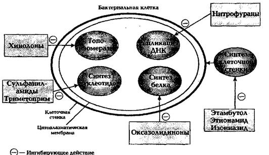 Механизм антибактериального действия фторхинолонов (рис.1) заключается в ингибировании бактериальных ферментов тоноизомераз II и IV (в том числе ДНК-гиразы - топоизомеразы II), что нарушает репликацию ДНК и соответственно образование РНК. Все это препятствует росту и размножению бактерий.