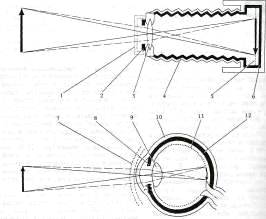Рис. 1. Схема, иллюстрирующая сходство между глазом и фотокамерой старого образца. 1 -затвор, ,2-диафрагма, 3-линза, 4-опорная структура, 5-светочувствительная пленка, 6-зачерненная поверхВнность, 7-веко, 5-радужка, 9-хрусталик, 10-склера, 11-сетчатка, 12-сосудистая оболочка.