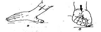 Перелом ладьевидной кости может произойти при падении на выпрямленную кисть (рис. 12), при прямом ударе по ладони. Иногда перелом может наступить при ударе кулаком о твердый предмет (см. рис. 12, б).