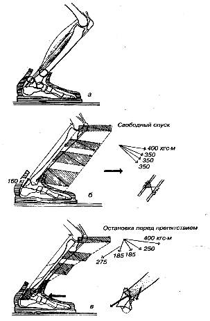 а тАФ современная лыжная обувь, фиксирующая голеностопный сустав, вызывает три вида травм: в области верхнего края ботинка, компрессию переднего края боль-шеберцовой кости, разрыв ахиллова сухожилия; б, в тАФ направление нагрузки при свободном спуске и столкновении с препятствием.