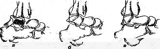 Рис. 29. Механизм травмы при повреждении боковых связок коленного сустава (правого)