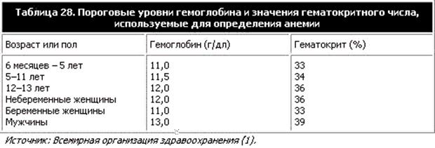 Железодефицитная анемия определяется как недостаточность железа, в результате которой уровень гемоглобина падает ниже статистически установленного для разных половозрастных групп порога. Пороговые уровни гемоглобина и гематокритного числа, определяющие анемию в зависимости от возраста и пола, показаны в таблице 6.