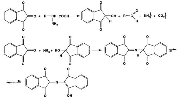 Нингидриновая реакция является общей для а-аминокислот, иминокислот, полипептидов. Нингидрин (1,2,3-трикето- гидринденгидрат) образует с аммиаком, выделившимся из этих соединений, продукт конденсации тАФ ион дикетогидрин- дилидендикетогидрамина, имеющий сине-фиолетовое окрашивание: