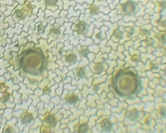 Микроскопия. При рассмотрении листа с поверхности видны клетки эпидермиса верхней стороны тАФ многоугольные со слабоВнизвилистыми стенками, нижней - с более извилистыми стенками. Диагностическое значение имеют - многочислен-ные погруженные устьица с 5-6 по-бочными клетками (аномоцитный тип). Устьица располога-ются на нижней и верхней стороне листа, но главным образом преобладают на верхней стороне - (это объясняется тем, что растение, как правило, находится в тени лесов, поэтому верхняя сторона листа освещается не значительно, и устьица особо не приводят к избыточномуиспарению воды). Эфиромасличные железки с обеих сторон листа, округлой формы, с просвечивающейся ножВнкой. Волоски многочисленные, располагаются только с нижней стороны, простые и головчатые. Простые волоски многоВнклеточные, нижние клетки (чаще 2 тАФ 4) короткие, со значительно утолщенными стенками, верхняя клетка тАФ длинная, изогнутая, с тонкими стенками. Головчатые волоски мелкие, состоят из коВнроткой многоклеточной ножки и шаровидной многоклеточной головки, лучше заметны по краю и по жилке листа.
