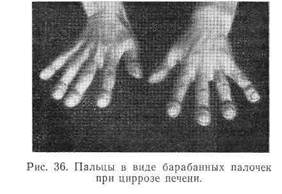 Питание больного вначале нормальное, в дальнейшем снижается, вплоть до кахексии. Кожа часто с серовато-грязным оттенком, наблюдается субиктеричность или выраженная желтуха, особенно при билиарном циррозе. На коже могут быть следы от расчесов, в тяжелых случаях тАФ геморрагии. Иногда на коже появляются телеангиэктазии (паукообразные расширения артериальных сосудов тАФ ангиомы, Влсосудистые звездочкиВ», впервые описанные С. П. Боткиным) (рис. 35), Нередко наблюдается гиперемия ладоней, иногда с желтушным оттенком (печеночная ладонь), а в более редких случаях тАФ изменение ногтей в виде часовых стекол, нерезко выраженное утолщение дистальных фаланг пальцев (Влбарабанные палочкиВ», рис. 36). На коже, особенно на внутренней поверхности век, можно выявить очаги отложения холестерина (ксантелазмы). Изредка у мужчин наблюдается увеличение молочных желез (гинекомастия).