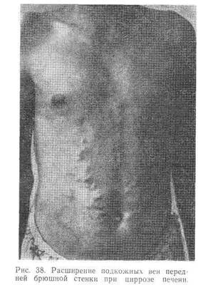 При физическом обследовании брюшной полости в ряде случаев отмечается метеоризм, часто расширение подкожных вен живота (рис. 38). Как правило, в начальной стадии печень увеличенная, плотная, с заостренным краем; часто прощупывается увеличенная селезенка.