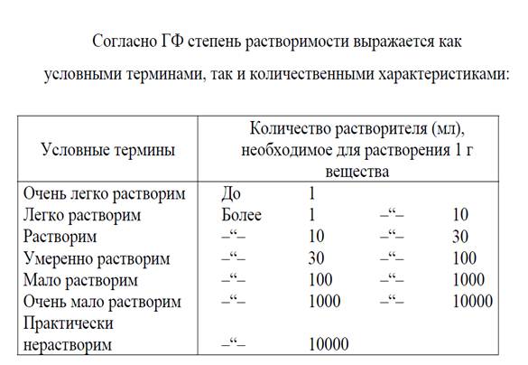 Растворение (перемешивание жидкостей, а также жидкостей и твердых тел) тАФ основная стадия изготовления растворов, применяемых наружно, внутрь и в виде инъекций, тАФ является довольно частой операцией при изготовлении лекарств. Наиболее важным из всех физико-химических свойств веществ является их способность растворяться в воде или других растворителях, т.е. растворимость. Растворимость количественно определяется концентрацией насыщенного раствора при данных условиях. Она может быть выражена теми же способами, что и концентрация (в процентах растворенного вещества или в молях на литр раствора), однако наиболее часто растворимость выражают числом граммов данного вещества, растворяющихся в 100 мл растворителя при определенной температуре. Показатели растворимости в разных растворителях приведены в частных статьях. Так, например, кислота ацетилсалициловая мало растворима в воде (растворима в горячей воде), легко - в спирте, в растворах едких и углекислых щелочей.