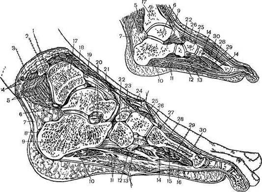 1 тАФ большеберцовая кость, 2 тАФ латеральный канал малоберцовой артерии, 3 тАФ короткая малоберцовая артерия, 4 тАФ малая подкожная вена Икроножный нерв, 5 тАФ длинный сгиВнбатель пальцев стопы, 6 тАФ таранная кость, 7 тАФ ахиллово сухожилие, 8 тАФ сухожильная сумка пяточной кости, 9 тАФ пяточная кость; 10 тАФ мышца, отводящая мизинец; 11тАФлатеВнральная подошвенная артерия и нерв, 12 тАФ короткий сгибатель пальцев, 13 тАФ квадратная мышца подошвы, 14 тАФ мышца, приводящая большой палец стопы, 15 тАФдуга стопы, 16 тАФ сухожилие длинного сгибателя пальцев, 17 тАФ малоберцовая кость, 18 тАФ длинный сгибаВнтель большого пальца стопы, 19 тАФ капсула голеностопного сустава, 20 тАФ таранно-пяточная связка, 21тАФтыльная артерия стопы, 22тАФ кубовидная кость, 23 тАФ ладьевидная кость, 24 тАФ капсула короткого разгибателя пальцев, 25 тАФ латеральная клиновидная кость, 26 тАФ короткий разгибатель пальцев, 27 тАФ дугообразная артерия, 28 тАФ тыльная межкостная мышца, 29 тАФ подошвенная межкостная мышца, 30 тАФ III плюсневая кость