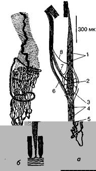 Рис. 4. Рецептори м'язiв: а тАФ вiльнi закiнчення аферентного волокна, якi обплiтають кiнець м'язового волокна; б тАФ м'язове веретено; 1,4тАФ закiнчення еферентного волокна; 2 тАФ закiнчення аферентного волокна; 3 тАФ капсула; 5 тАФ внутрiшнi м'язовi волокна; 6, 8 тАФ еферентне волокно; 7 тАФ аферентне волокно рецептор.