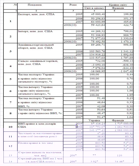 В табл.1.2 наведенi результати аналiзу зростання обсягiв зовнiшньоекономiчноi торгiвлi Украiни з всiм свiтом та питома вага торгiвлi з Францiiю у 2005 - 2008 роках.