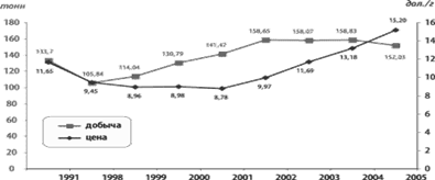 Рис. 5. Объемы добычи и динамика изменения цен на золото в период с 1991 по 2005 годы.