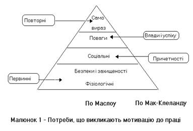 Перша з розглянутих теорiй називаiться iiрархiiю потреб Маслоу (малюнок 1). Сутнiсть ii зводиться до вивчення потреб людини. Це бiльш рання теорiя. РЗi прихильники вважали, що предметом психологii i поводження, а не свiдомiсть людини. У основi поводження лежать потре6и людини, що можна роздiлити на п'ять груп:
