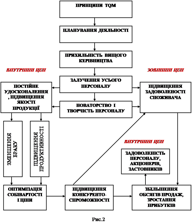 Загалом робота органiзацii за цими принципами зорiiнтована на запобiгання випуску неякiсноi продукцii, а не ii виправлення. Застосування новоi моделi управлiння, яка використовуi принципи TQM, дозволить органiзацii досягти головних внутрiшнiх та зовнiшнiх цiлей, якi зображено на рис. 2.