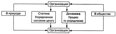Как видно из приведенной схемы (рис.1.1), организация может рассматриваться в статике и динамике. В статике - это некоторое целостное образование (социальное, техническое, физическое, биологическое), имеющее вполне определенную предназначенность. В динамике она представляется в виде разнообразных процессов по упорядочению элементов, формированию и поддержанию целостности вновь создаваемых или функционирующих природных объектов. Эти процессы могут состоять из целенаправленных действий людей либо из естественных физических процессов, т.е. иметь самоорганизующее начало.
