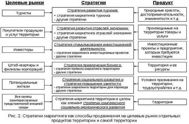 Со стратегиями маркетинга территории ситуация обстоит сложнее. Можно выделить два подхода к определению понятия, места и роли маркетинга территории. Первый подход исходит из тАЬклассическоготАЭ определения маркетинга территории как процесса проектирования места, которое будет удовлетворять потребностям целевых рынков. Маркетинг достигает успеха, когда жителям нравятся их места, а ожидания туристов и инвесторов оправдываются. Продвижение территории также входит в задачи маркетинга, но занимает второстепенное положение. [5, с.161]. Разработанная на основе этого определения стратегия маркетинга, по сути, отождествляется со стратегией развития территории и включает в себя формирование видения, целей, направлений деятельности, механизм реализации и т.д. Верно и обратное: если стратегия развития разработана на основе маркетингового подхода, исходя из текущих и прогнозируемых потребностей внешней среды, она может трактоваться как маркетинговая стратегия развития. Однако на практике при определении стратегий маркетинга территории чаще всего используется второй подход. В рамках второго подхода стратегии маркетинга понимаются более узко: как способы продвижения на целевые рынки отдельных продуктов территории и самой территории [6, 7] (рис.2).