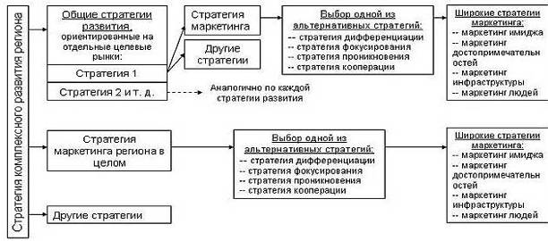 Таким образом, можно предложить следующую блок-схему стратегий маркетинга и их взаимосвязи со стратегиями развития региона (рис. 3):