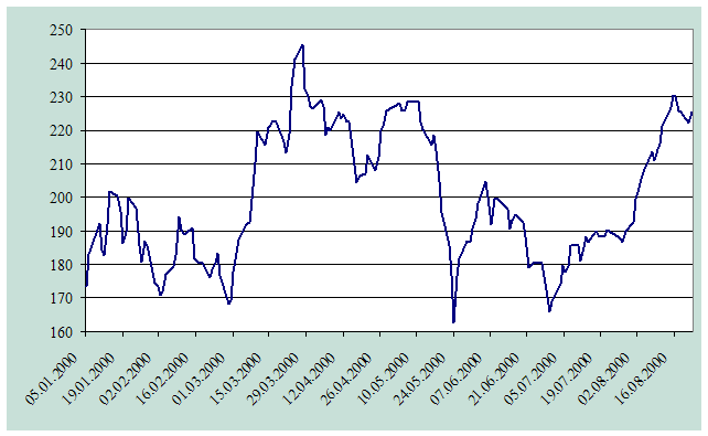 Рис. 2. Динамика индекса РТС1-Интерфакс за январь-август 2000 г.