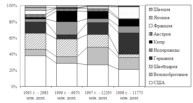 Темпы привлечения иностранных вложений в Россию носят понижательный характер. Так, если за 9 месяцев 1998 г. объем вложенных в российскую экономику иностранных инвестиций составлял 86,4% от уровня соответствующего периода 1997 г., то в 1999 г. данный показатель оценивался в 69,6%. В целом, на конец сентября 1999 г. объем накопленных иностранных инвестиций в России составил 28,4 млрд. долл. (рис. 7).