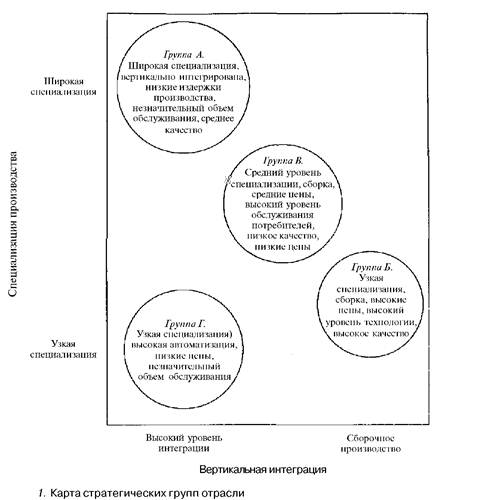 Стратегические группы формируются по многим причинам, например, по изначальным преимуществам и слабым сторонам, по времени вхождения в отрасль, по историческим обстоятельствам. Однако коль скоро такие группы образовались, фирмы одной стратегической группы, как правило, объединяет основное содержание стратегии. Следуя сходным стратегиям, они нередко имеют близкие показатели доли рынка, испытывают похожие воздействия и одинаково реагируют на внешние явления или конкурентные действия в отрасли. Эти характеристики позволяют составить карту стратегических групп и использовать ее в качестве аналитического инструмента.