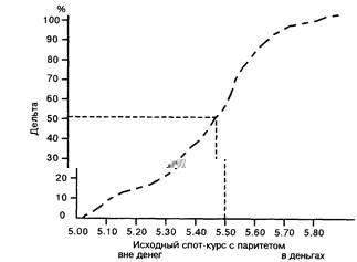 Пример. Дельта 0,65 по опциону "колл" ф.ст./доллар на сумму 50 000 фунтов равняется эквивалентной позиции 32 500 фунтов на спото-вом рынке.