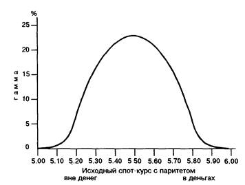 Таким образом, гамма приближается к нулю для опционов, которые очень "вне денег" или "в деньгах". Гамма (или ее абсоВнлютная величина в случае, когда она отрицательна) имеет макВнсимальную величину для опционов "с паритетом".