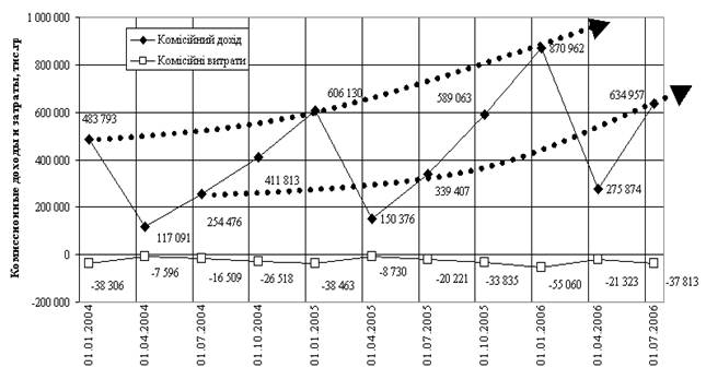 а) Устойчивым ростом объемов комиссионных доходов с уровня 483,8 млн.грн. в 2003 году до: