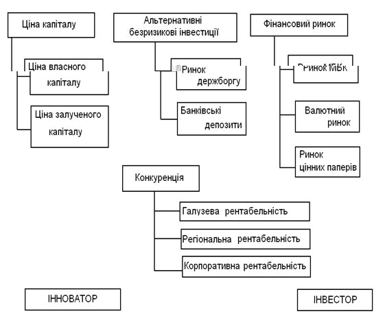 Норма прибутку визначаiться iноватором i iнвестором з рiзних точок зору (рис 1.6). Органiзацiя, що реалiзуi нововведення, виходить iз внутрiшнiх обмежень, до яких у першу чергу вiдносяться цiна капiталу, внутрiшнi потреби виробництва (обсяг необхiдних власних засобiв для реалiзацii виробничих, технiчних, соцiальних програм), а також зовнiшнi фактори, до яких вiдноси