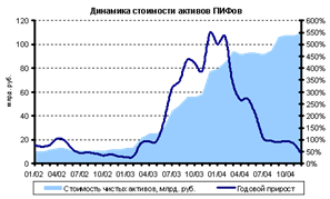 Помимо показателей институциональной структуры, подтверждением активного развития рынка ПИФов также является кратный рост стоимости чистых активов фондов (iА). Всего за период 2002-2004 гг. общая iА ПИФов выросла более чем в 12 раз. При этом наиболее активная фаза роста пришлась на 2003 г. (объем iА (стоимости чистых активов фондов) увеличился в 5,5 раз). А с начала 2004 г. наблюдается замедление годовых темпов прироста iА (см. рисунок ниже). На 31 декабря 2004 г. стоимость чистых активов фондов, по данным Национальной лиги управляющих, составила 109,6 млрд. руб. ($3,95 млрд), увеличившись с начала года на 42% в рублевом выражении.