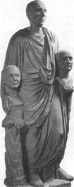 Римляни постають одягненими в парадний одяг тАФ тогу. Портрет покликаний прославити знатнiсть роду, а пiзнiше був пов'язаний з обожнюванням особи iмператора. Раннi зображення передають силу i стiй-кiсть характеру. Розвитку римськоi скульптури сприяв стародавнiй звичай робити посмертнi маски i зберiгати в будинку створенi по них бюсти знаменитих предкiв, що передавалися з поколiння в поколiння. Збереглося зображення римського аристократа з портретами предкiв (рис. 1.2.).