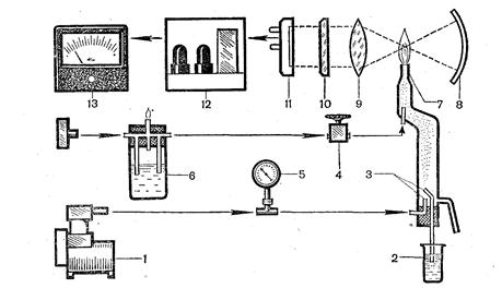 1 тАФ компрессор; 2 тАФ стакан с анализируемым раствором; З тАФ распылитель; 4 тАФ вентиль, регулирующий подачу газа; 5 тАФ манометр; б тАФ промывалка; 7 тАФ горелка; 8тАФ вогнутое зеркало; 9 линза; 10 тАФ светофильтр (монохрома тор); 11тАФфотоэлемент (фотоумножитель); 12 тАФ усилитель; 13 тАФ стрелочный гальванометр.