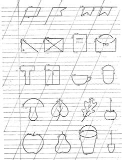 До першого виду вправ вiдносять малювання з штриховкою. Цi вправи мають своi етапи: робота з готовою формою, поданою в зошитi i самостiйне малювання предметiв i штриховка iх.