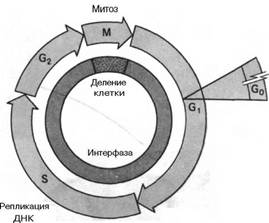 Клеточный цикл: митоз и цитокинез составляют М-фазу цикла, кульминацией которой является образование двух дочерних клеток. Каждая дочерняя клетка вступает в G1-период интерфазы и может начать новый клеточный цикл. За периодом G1 следует S-фаза, во время которой ДНК и хромосомы дуплицируются, и далее - фаза G2. Начало митоза означает конец интерфазы. Покоящиеся клетки задерживаются в фазе G1 и, как говорят, находятся в фазе G0. Обычно эукариотические клетки, которые не остановились в фазе G0, завершают цикл за 24 ч.