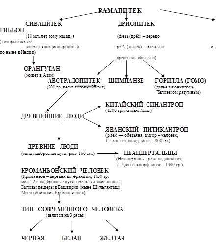 От Австралопитека пошли: Древнейшие люди → Древние люди (Неандертальцы) + (Китайский Синантроп + Яванский Питикантроп) → Кроманьонский человек → Тип современного человека.